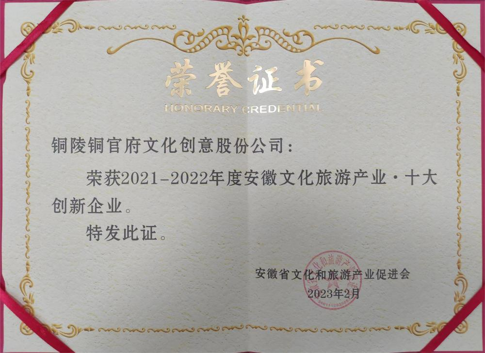 日前,由安徽省文化和旅游產(chǎn)業(yè)促進(jìn)會(省文促會)主辦的第二屆安徽文化旅游產(chǎn)業(yè)2021-2022年度頒獎盛典暨新春聯(lián)誼會活動在合肥舉行,2021-2022 年度“七個十”榜單公布。銅陵銅官府文化創(chuàng)意股份公司榮獲“2021-2022年度安徽文化旅游產(chǎn)業(yè) · 十大創(chuàng)新企業(yè)”,公司創(chuàng)始人趙敏榮獲“2021-2022年度安徽文化旅游產(chǎn)業(yè) · 十大榜樣人物”。