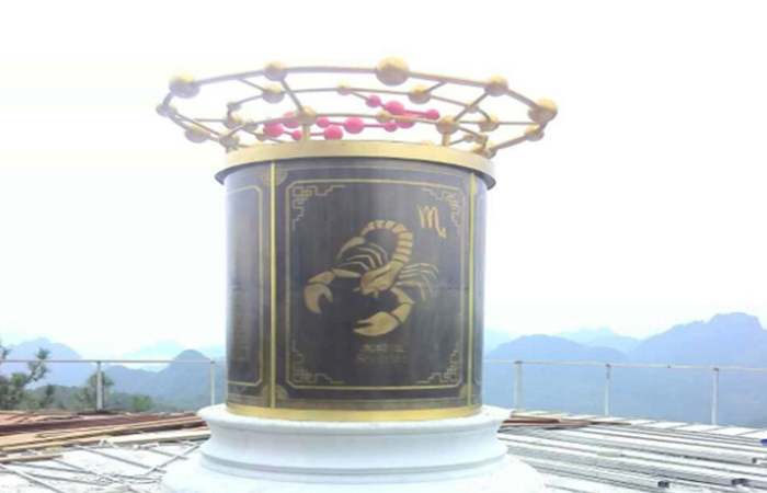 十二星座整體采用直筒造型,簡潔大方,大氣穩(wěn)定。采用精銅雕刻工藝精制而成的十二星座銅柱周圍的浮雕。